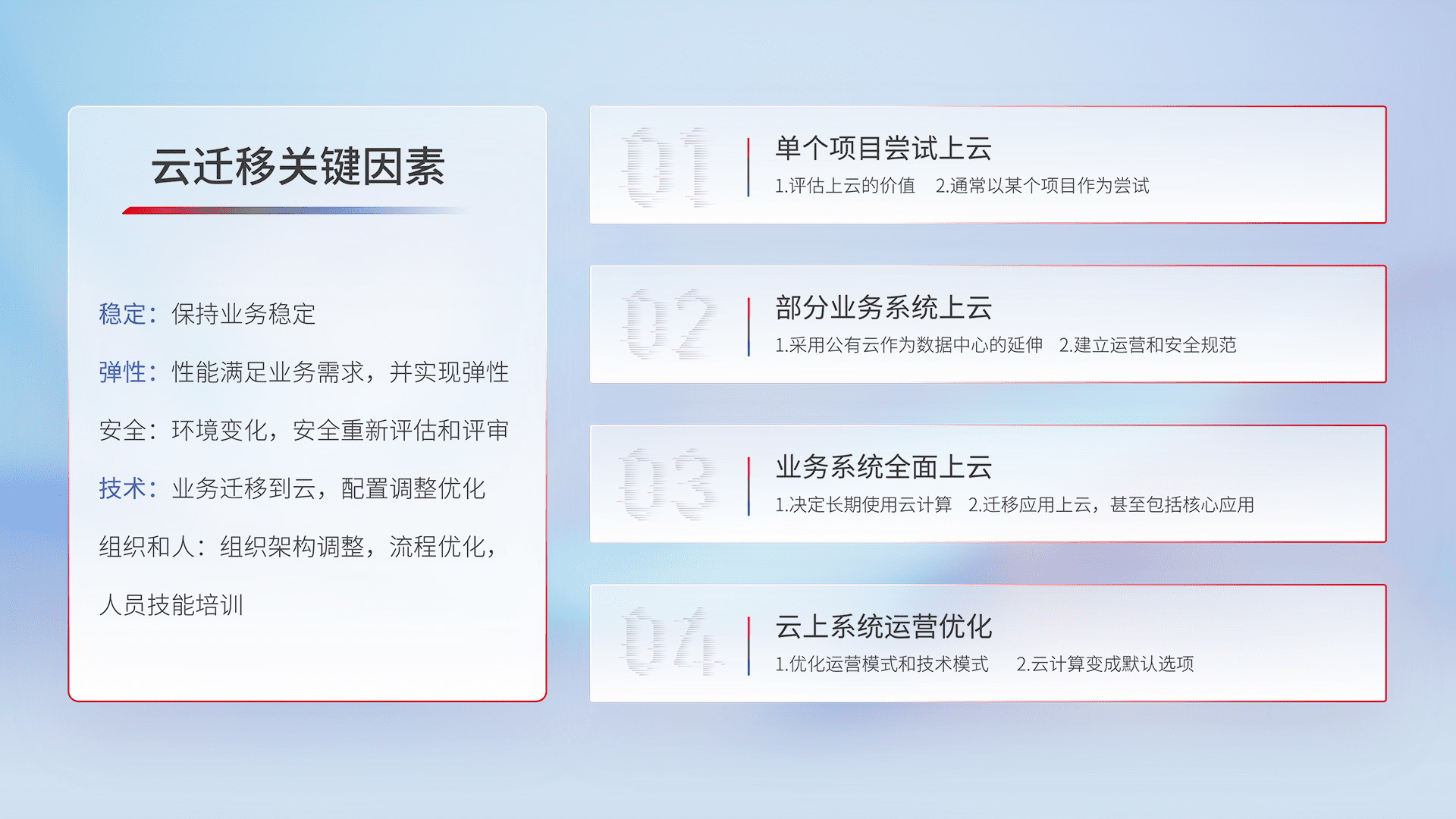 结合实际业务,,从规划设计、、云平台选型、、、云原生改造、、、、数据迁移、、集成交付,,,迁移全过程为客户识别最佳上云路径,,,做好风险识别管理,,,设计网络架构、、、身份权限、、、安全审计合规、、操作审计、、、、日志审计、、、、监控告警策略、、、多站点容灾设计等,,对云上基础设施进行整体规划,,提升IT治理水平,,,以满足弹性、、、、高可用、、高性能的需求。。。